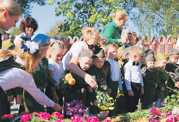 Смоленские школьники возлагают цветы к мемориальному комплексу героям-сибирякам, которые держали оборону города Ярцево. Фото: mos.ru
