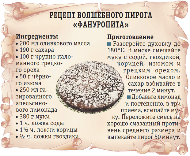 Гвоздём праздника стал пирог «Фануропита». Своё название он получил в честь святого Фанурия (считается покровителем и защитником города и всего острова Родос. – Ред.). Говорят, что пирог не только вкусный, но ещё и волшебный. Есть мнение, что святой, в честь которого он назван, если его очень попросить, помогает разыскать потерянные вещи. И пирог – это, можно сказать, благодарность за помощь. Словом, греки верят: если что-то потеряли, нужно испечь «Фануропиту», и пропажа обязательно найдётся.