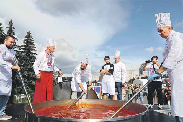 Рассольник варили в кастрюле, в которой с лёгкостью могли бы поместиться человек 15. В приготовлении участвовало около 50 поваров со всей России.