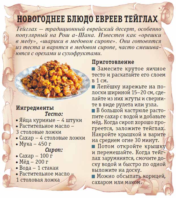 В начале праздничного застолья евреи съедают хлеб хала и дольку яблока, обмакнув её в мёд. Это залог того, чтобы новый год был сладким и сытым.