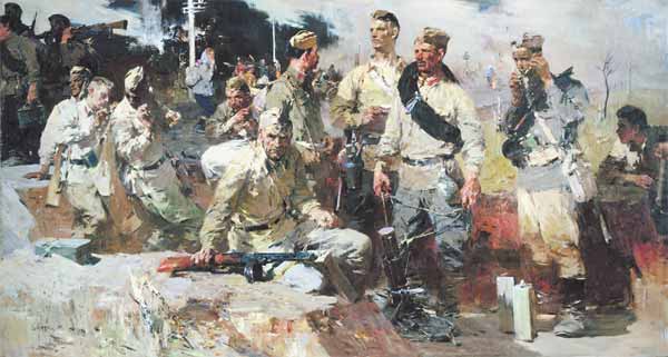 Картина «Ополченцы» Евсея Моисеенко — один из самых пронзительных экспонатов выставки.