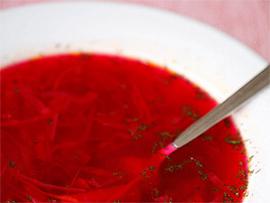 Что надо: Свёкла, 1 луковица и лук-порей, корень петрушки, сухие грибы, белые бобы, свежая капуста («восьмушка кочня»), картофель, пряности (лавровый лист, перец, гвоздика, укроп, майоран), ложка свекольного сока, соль, смешанная с молотым перцем.