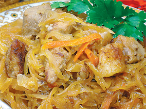 Надо: 400 г свинины, 150 г ветчины, 3 ст. ложки свиного жира, 4 средние головки репчатого лука, 2 помидора, 2-3 кислых яблока, небольшой кочан капусты, соль, чёрный перец горошком, лавровый лист.