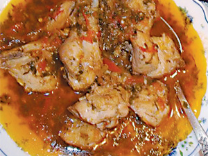 Надо: 1 целая курица, 3 средние головки репчатого лука, 2 свежих помидора средней величины или 3 консервированных, 3 зубчика чеснока, острый красный перец, пучок кинзы, 1,5 ч. л. хмели-сунели, 1 ст. ложка топлёного масла, соль.