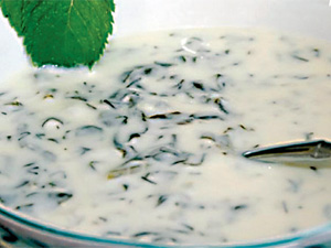 Надо: 1,5 л мацони или кефира, 200 г сметаны, 1 яйцо, 3 ст. л. риса, небольшой пучок шпината, кинза, укроп, зелёный лук, мята.