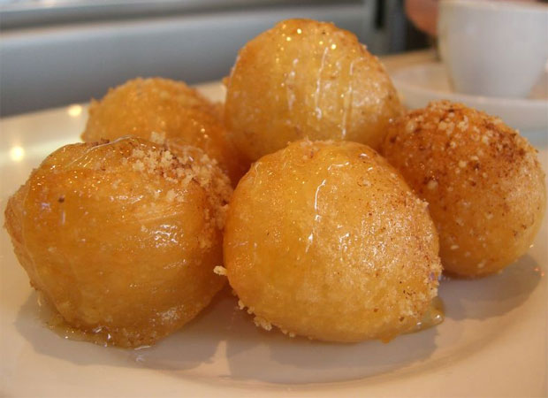 2. Разогреть в сотейнике растительное масло. Смазать маслом ладони, взять часть теста в руку и, выдавливая небольшие шарики, осторожно опускать их в масло, выпекать до золотистого цвета. Готовые лукумадес выложить в тарелку на блюдо, посыпать сахарной пудрой или полить мёдом.