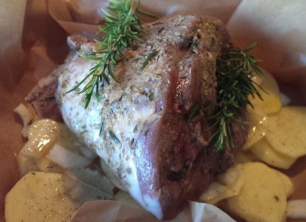 Мясо порезать на крупные куски, натереть специями, нашпиговать чесноком и фетой. Крупно нарезать овощи, всё вместе выложить на пергамент и герметично упаковать в фольгу. В сотейник положить свёрток с мясом, налить воды на 5-7 см и сверху закрыть всё это фольгой. Томить в духовке 4-5 часов.