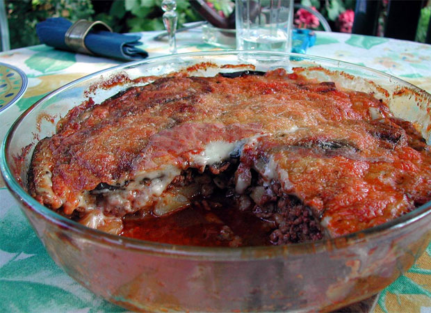 4. На глубокий противень выложить слоями баклажаны, сыр, фарш, помидоры, залить соусом и посыпать сыром. Выпекать в духовке (170 градусов) 40 минут.