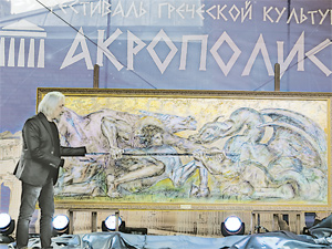 III фестиваль греческой культуры «Акрополис», организованный греческой диаспорой, в этом году был необычным по размаху. И греки начали торжественную церемонию открытия своего праздника с подарка москвичам. Художественное полотно к 870-му дню рождения столицы создал известный русско-греческий живописец Костас Эфимидис (его имя внесено в международный атлас самых выдающихся творцов греческой земли!). Вручение подарка получилось максимально символичным. Потому что, как только на сцене вспомнили о том, что земля Эллады подарила человечеству шедевры литературы, искусства и философии, которые являются неиссякаемым источником вдохновения для многих поколений творцов, греки тут же взяли и сделали новый подарок - картину с изображением покровителя столицы святого Георгия Победоносца.