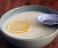 3. Выключить огонь, влить яично-лимонную смесь в бульон и энергично взбивать до бархатистой структуры. Добавить в суп кусочки курицы. Подавать его с дольками лимона и гренками.