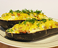 1. Разрезать пополам баклажаны и поместить в подсоленную воду на 25 минут, обсушить.