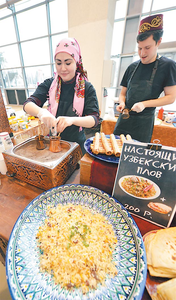В соседнем павильоне башкиры всем желающим дают пробовать знаменитый башкирский мёд с чаем из горных трав. Татары угощают эчпочмаком и предлагают восточные тапочки с загнутыми вверх носами. Письмописец из Ирана по просьбе посетителей выводит на бумаге их имена в персидской каллиграфии.