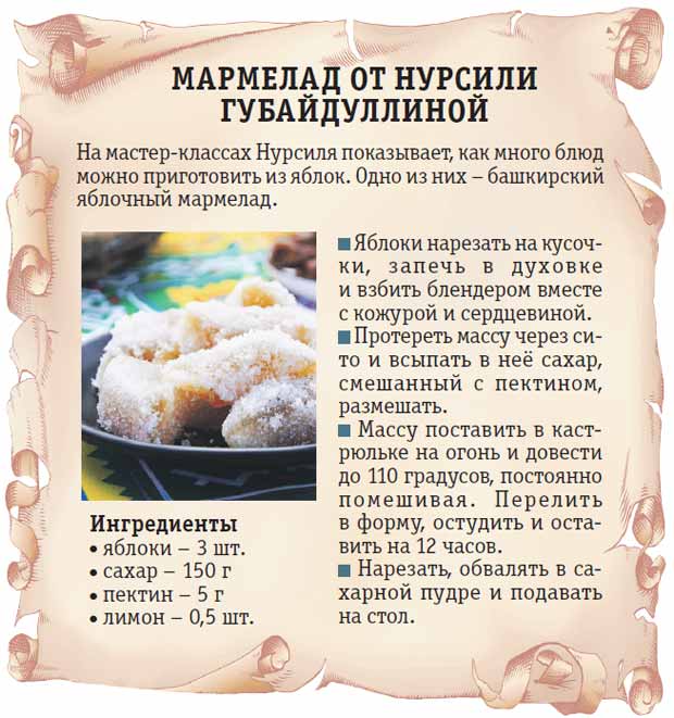 «Бабушка со стороны мамы делала пастилу по классическому башкирскому рецепту, – вспоминает Нурсиля. – Запекала яблоки в печи, перетирала через сито, размазывала получившееся пюре по дощечкам и отправляла сушить на веранду.
