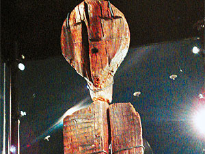 Если у человеческих ликов носы нарисованы, то в зверином лике в качестве носа использован выступающий из плоскости естественный сучок, что придаёт морде несколько карикатурный характер. Всего ликов семь - по числу поколений предков, которые хранятся в памяти племени. Личины венчают антропоморфные фигуры, изображённые то ли в виде скелетов, то ли наподобие рентгеновских снимков - обнажающими костную структуру.
