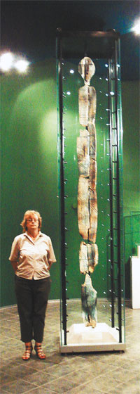 Светлана Панина, заведующая музейным отделом археологии и этнографии, включает подсветку в зале, отведённом Большому Шигирскому идолу. Внутри стеклянного короба-саркофага, специально сделанного на одном из оборонных предприятий города, высятся сложенные по вертикали фрагменты идола, вырезанные из лиственницы. По высоте можно различить разделённые орнаментальными вставками лики - шесть человеческих и морду то ли медведя, то ли кабана.
