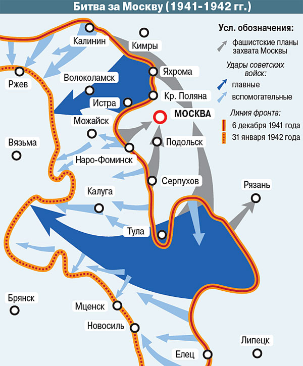 «Битва за Москву делится на два этапа: первый, который принято называть «оборонительным», длился с 30 сентября по 4 декабря 1941 года, - комментирует эксперт «СтоЛИЧНОСТИ», преподаватель истории Олег Квасов. - На взятие Москвы Гитлер бросил почти половину всех своих войск - 1,9 млн солдат и офицеров, 1700 танков, свыше 14 тыс. орудий, 1390 самолётов. Осадное положение ввели в Москве 20 октября. К концу месяца нашей армии, значительно уступавшей по численности и особенно по вооружению, ценой огромных потерь удалось приостановить наступление противника. Несмотря на сложную ситуацию, 7 ноября на Красной площади прошёл легендарный парад, с которого воинские части отправлялись прямо на фронт. Второе наступление врага на Москву началось 15 ноября 1941 года - немцам удалось выйти на подступы к столице в начале декабря: на севере - в районе Дмитрова, на юге - около Тулы. Проявляя массовый героизм, советские войска смогли сдержать противника, который исчерпал все свои резервы и сам перешёл к обороне. С этого момента историки выделяют второй этап битвы за Москву - «наступательный» (с 5-6 декабря 1941 года по 20 апреля 1942 года). В декабре - январе в ходе нескольких военных операций Красной армии удалось отбросить противника от столицы, в результате были освобождены Калинин (ныне Тверь), Калуга, Малоярославец, а также другие города и сёла. Таким образом, план фашистов по молниеносному захвату СССР потерпел крах. А зимой 1942 года началось общее наступление советских войск».