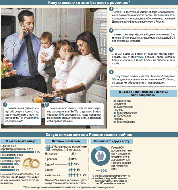 Несмотря на огромное число разводов, большинство россиян привержено традиционным семейным ценностям, характерным для русской христианской культуры. Но есть и некоторые отличия от семей этнических или исповедующих другую религию. Таковы данные нового исследования социологов.