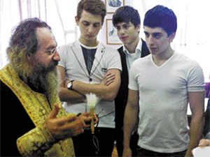 Архимандрит Иоанн беседует с учениками после молебна в честь начала учебного года
