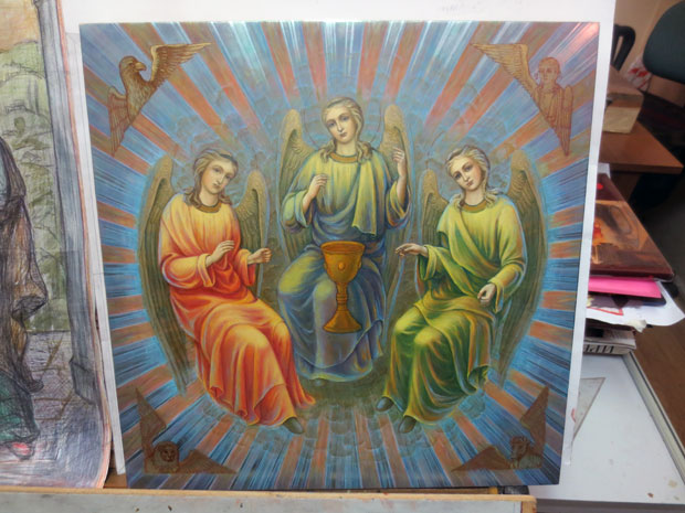Художник Светлана Аверина стоит перед рисунком, на котором изображена Троица, и внимательно всматривается в него. «Нужно правильно подобрать цвет, сочетание золота и красок, - тихо говорит она. - Вот здесь понадобятся сквозные краски. Очень много разных факторов, их сложно совместить. К тому же для нас это экспериментальная работа, такой иконы в мире ещё нет. Эта будет первой».