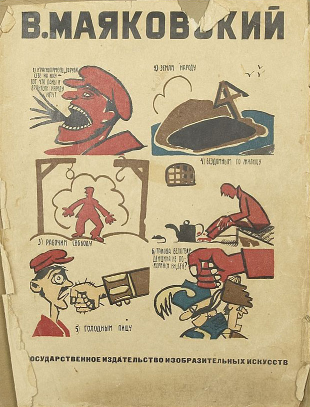 В феврале 1917 г. В. Маяковский со своим другом карикатуристом А. Радаковым начали революционную пропаганду, издав серию лубков с плакатными элементами. Первые работы петроградского издательства «Парус», в котором и работал Маяковский, касались разоблачения старого строя. «Уж сгною, скручу их уж я!»/думал царь, раздавши ружья./Да забыл он, между прочим,/что солдат рождён рабочим» - такими четверостишиями Маяковский-художник подписывал свои работы.
