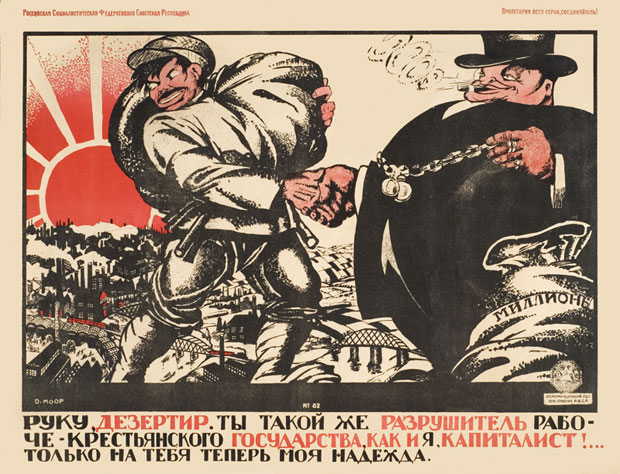 Первая мировая война (1914-1918 гг.) диктовала новый язык. И первыми на нём стали говорить именно авангардисты. В это время зарождается школа политического плаката. До этого у нас плакатов почти не было. Была реклама и был лубок - яркое изображение с подписью, отличающееся простотой и доступностью образов. В последнем отметились многие известные футуристы и авангардисты: Маяковский, Бурлюк, Машков, Малевич и др.