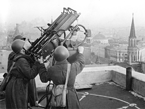 Советские зенитчики на крыше гостиницы «Москва». На заднем плане виден замаскированный Кремль