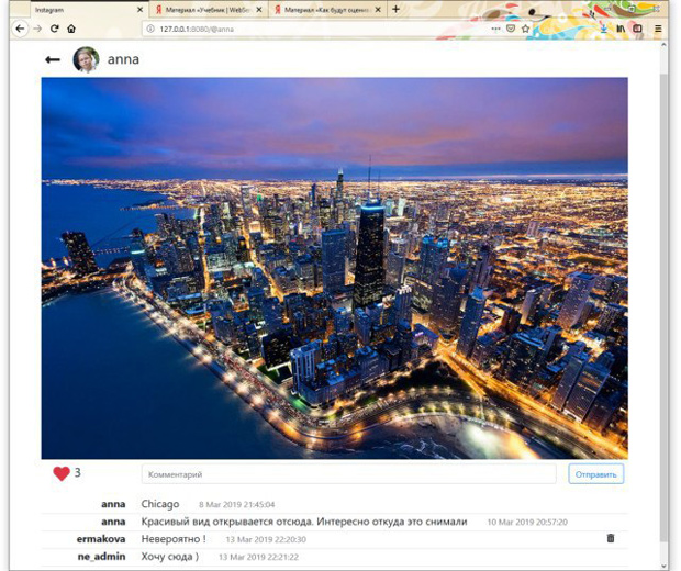 Пример поста в аналоге Инстаграма, созданном Е. Ермаковой.