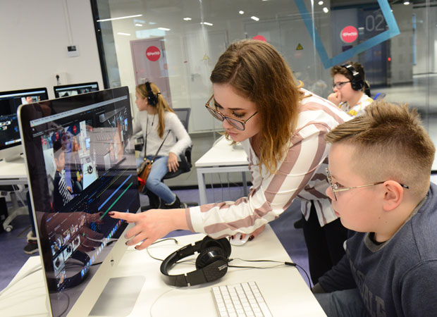 Оставляем команду колдовать над новостями, а тем временем навещаем другую группу – за мониторами в студии видеомонтажа. Застаём школьников за съёмками: прямо здесь они танцуют, снимают шутливые видео на телефоны и загружают в компьютеры. Осталось подобрать подходящую музыку, и начнётся занятие по монтажу собственных видео.