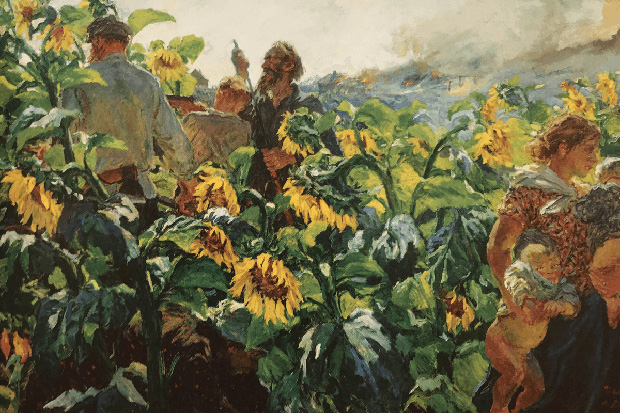 Человеком, который первым в живописи заявил тему Великой Отечественной войны, причём не в привычном всем батальном жанре, а в виде трагедии, которая врывается в будни людей, стал Аркадий Пластов. Произведение «Немцы идут» он написал летом 1941 г. На первый план выходит светлая, яркая, мирная жизнь. Залитое солнцем подсолнуховое поле заполняет почти всё пространство картины, а вдалеке – горящая деревня.