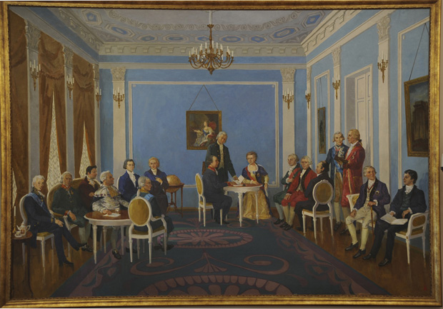 Княгиня Екатерина Дашкова основала и возглавила Российскую академию наук. Фото: Картина «Заседание Академии Российской». Художник А. Д. Лукашёнок (из экспозиции музея «Нарвская застава»)