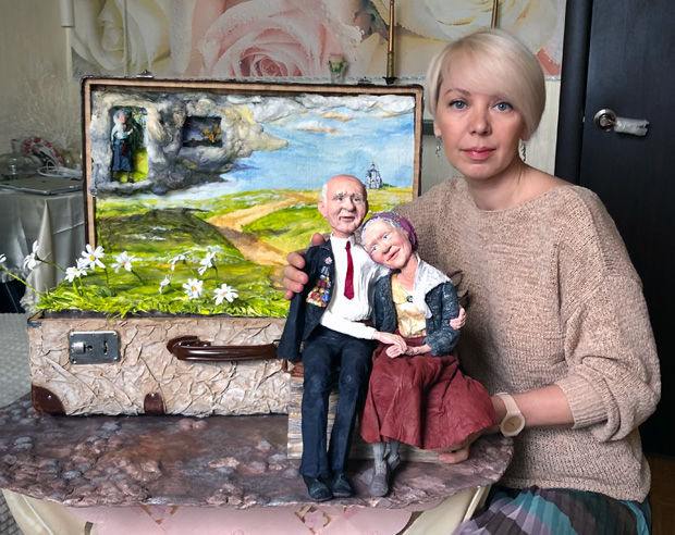 У игрушек Анастасии есть отличительное качество — они восхищают. Неужели всё это появилось из обычной ваты, упаковка которой стоит 60 рублей! Весной 2020-го, на самоизоляции Анастасия изготовила композицию ко Дню Победы. Пожилая семейная пара сидит на скамеечке, за их спиной — огромный чемодан с воспоминаниями. Фоном из ваты выполнено ромашковое поле и синее небо, вдалеке виднеется храм. На небе появляются грозовые тучи как напоминание о войне. Часть композиции — это фотоальбом ветеранов. Анастасия взяла настоящие военные снимки и перерисовала чёрно-белые изображения карандашом в мини-варианте. Композиция завоевала гран-при на одном из всероссийских конкурсов.