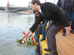 Цветы и венки в воде — поминание погибших в годы войны цыган. Фото 2019 г.
