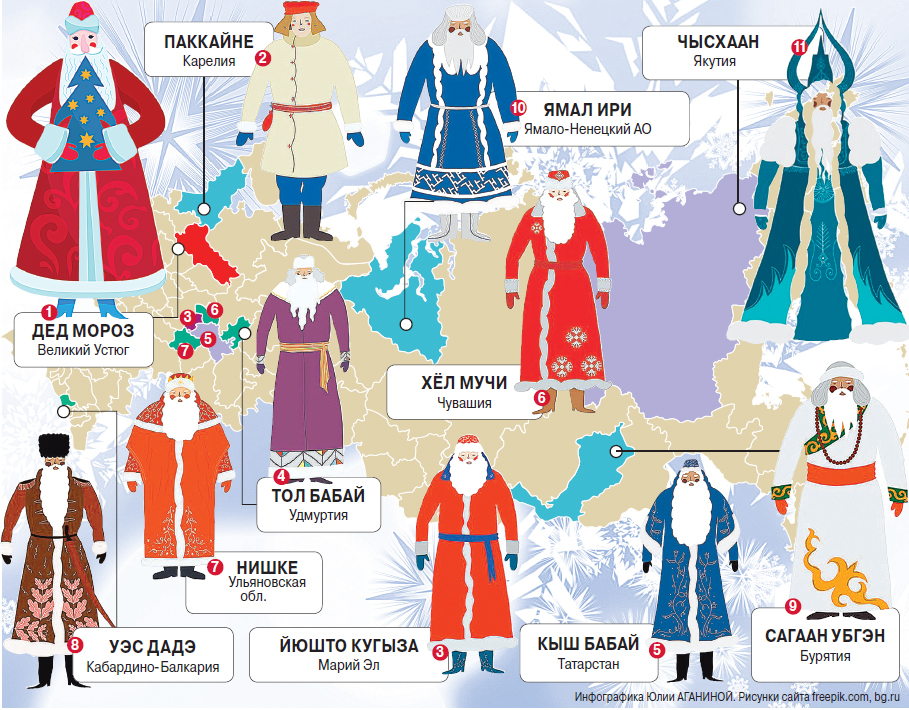 И это не все Деды Морозы, живущие в России. Есть ещё башкирский Кыш Бабай, осетинский Артхурон, мурманский Мунь Калса, алтайский Соок-Таадак, калмыцкий Аав Киитн, чеченский Гор Дада, Кёдзыд Пёль в Коми и другие.