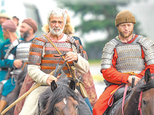 Очередной пункт «дороги» – Национальный парк «Валдайский». После перехода – привал. Ведь участники похода хоть и на конях, но на каждом 12-килограммовая кольчуга, щит и меч, латы и луки – одежда «дружинников» точь-в‑точь повторяет средневековую, как и оружие. Чтобы зрители увидели, как в бою наши предки обращались с копьём и даже топором.
