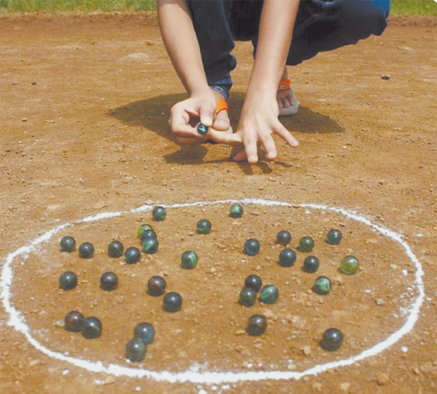 Нужны несколько мелких камешков и плоский камень-бита. Камешки складываются в очерченный кружок диаметром около 30 сантиметров, играющие отходят на 3–4 метра и чертят линию. С неё по очереди кидают биты в кучу камешков, стараясь выбить их за линию. Если промахнулся, бита остаётся лежать на месте. Когда все сделали броски, а камешки в кружке остались, остатки выбивает тот, чей камень ближе к мишени. После него – второй по точности и т. д. И так до тех пор, пока в кружке не останется ни одного камешка. Побеждает тот, кто выбил больше камней.