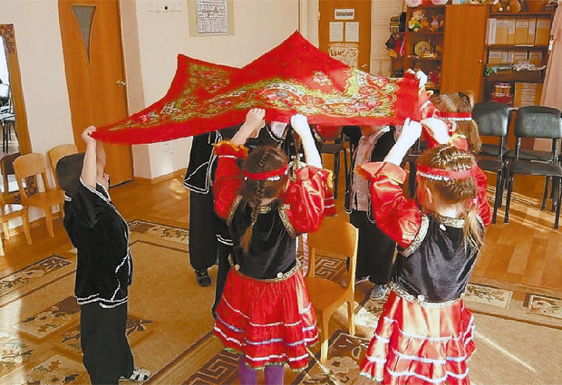 После этого дети образуют хоровод вокруг стульев. Когда музыка заканчивается, каждый должен подбежать к своему стулу и вместе с другими растянуть над ним платок, образовав крышу юрты. Побеждают те, кто сделает это первым.